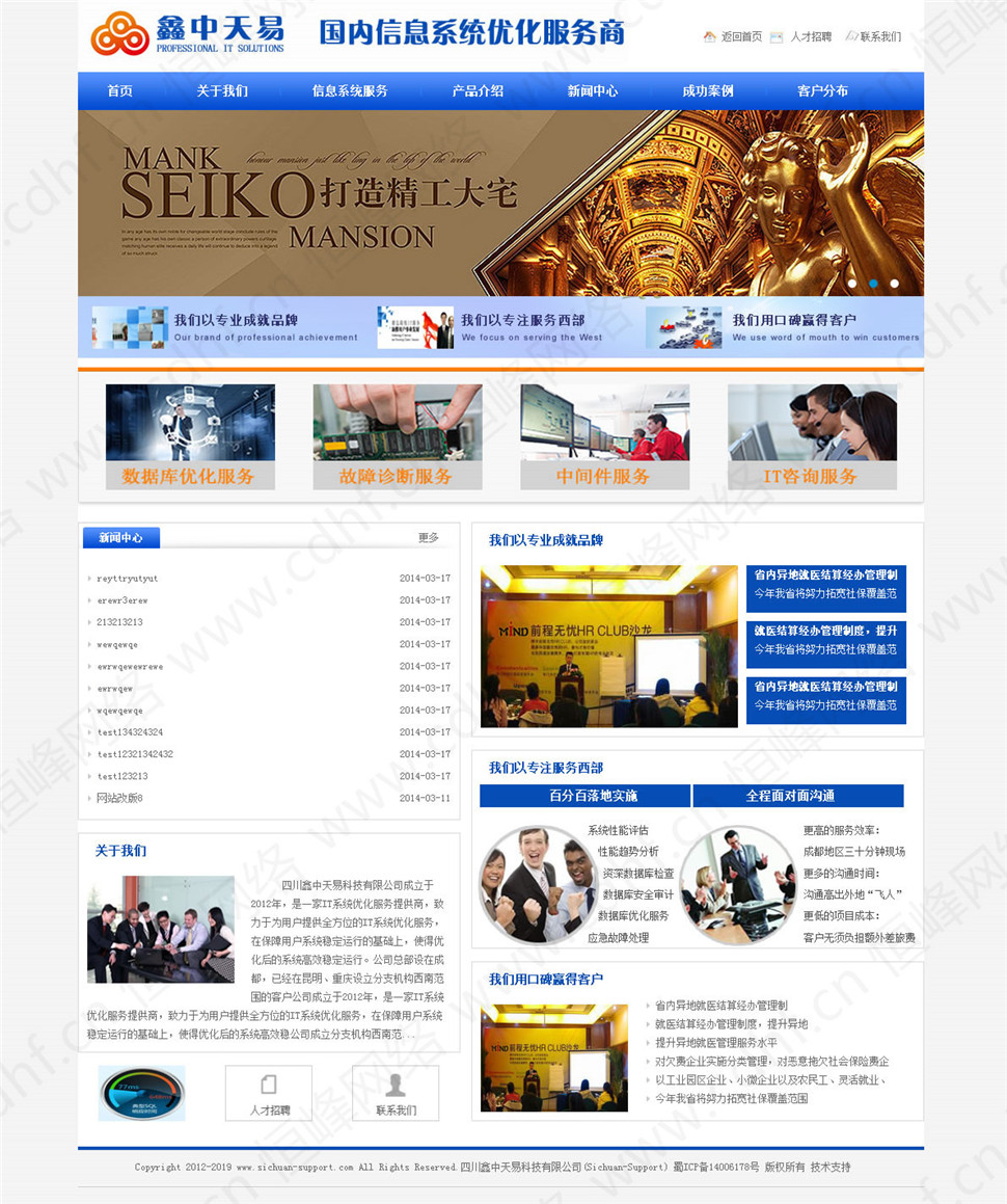 四川鑫中天易科技有(yǒu)限公司成立于2012年,是一家IT系統優化服務提供商,緻力于爲用(yòng)戶提供全方位的(de)IT系統優化服務,在保障用(yòng)戶系統穩定運行(xíng)的(de)基礎上(shàng),使得優化後的(de)系統高(gāo)效穩定運行(xíng)。公司總部設在成都(dōu),已經在昆明(míng)、重慶設立分(fēn)支機構西(xī)南範圍的(de)客戶公司成立于2012年,是一家IT系統優化服務提供商,緻力于爲用(yòng)戶提供全方位的(de)IT系統優化服務,在保障用(yòng)戶系統穩定運行(xíng)的(de)基礎上(shàng),使得優化後的(de)系統高(gāo)效穩公司成立分(fēn)支機構西(xī)南範圍的(de)客戶公司成立于2012年,是一家IT系統優化服務提供商,緻力于爲用(yòng)戶提供全方位的(de)IT系統優化服務,在保障用(yòng)戶系統穩定運行(xíng)的(de)基礎上(shàng),使得優分(fēn)支機構西(xī)南範圍的(de)客戶公司成立于2012年,是一家IT系統優化服務提供商,緻力于爲用(yòng)戶提供全方位的(de)IT系統優化服務,在保障用(yòng)戶系統穩定運行(xíng)的(de)基礎上(shàng),使得優化後的(de)系統高(gāo)效穩公司成立于2公司成立于2012年,是一家IT系統優化服務提供商,緻力于爲用(yòng)戶提供全方位的(de)IT系統優化服務,在保障用(yòng)戶系統穩定運行(xíng)的(de)基礎上(shàng),使得優化後的(de)系統高(gāo)效穩定運行(xíng)。公司總部設在成都(dōu),已經在昆明(míng)、重慶設立分(fēn)支機構,爲西(xī)南範圍的(de)客戶提供高(gāo)品質的(de)IT服務。